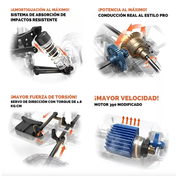 Incluye una batería recargable de 7.4V 1300 mAh, que ofrece entre 30-50 minutos de uso real, dependiendo del modo de velocidad y el terreno.